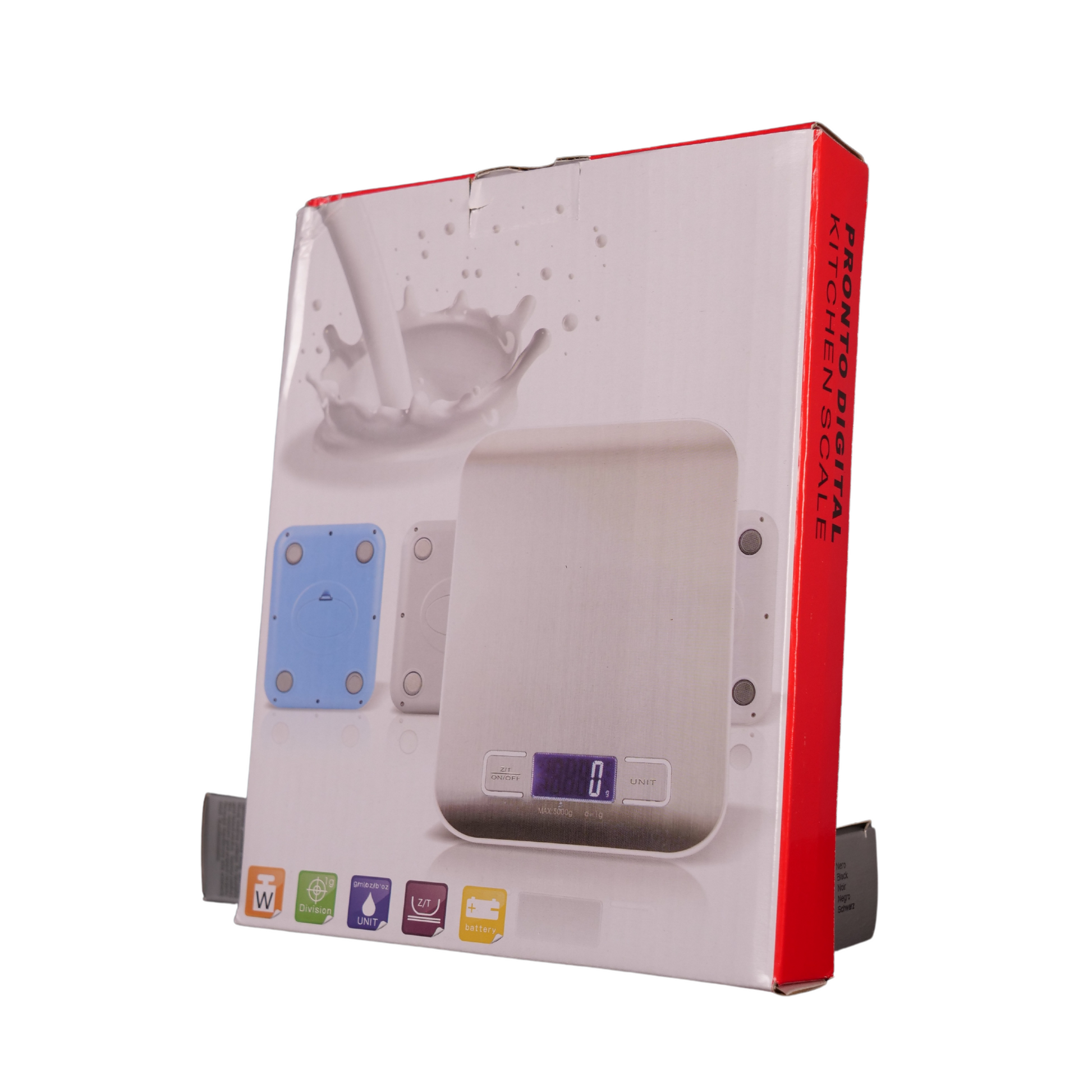 Stainless steel digital scale with tare function. (2) AAA batteries included.