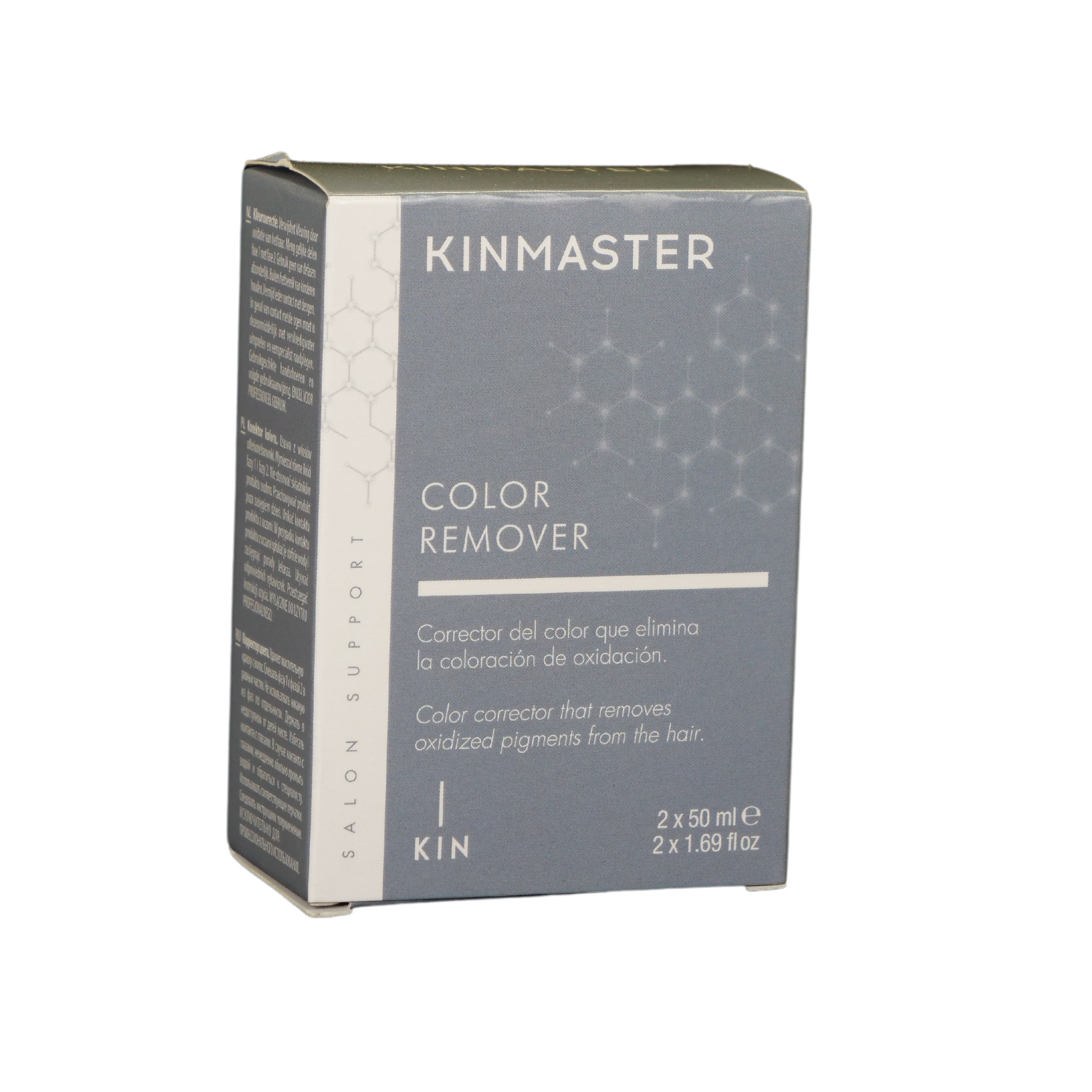 Kinmaster Color Remover uses a gentle sulfur and citric acid based solution to decouple oxidative dye inside of the hair shaft. It does not lift or lighten natural melanin, but previous lift will become exposed as artificial dye is removed. Approximately 1 to 2 applications per box.